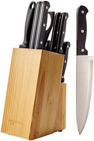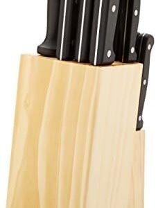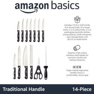 • 14-piece knife set incluedes: (1) 8” Chef’s knife, (1) 8” Slicing knife, (1) 8” Bread knife, (1) 5.5” Utility knife, (1) 3.5” paring knife, (6) 4.5” steak knife, (1) 8” kitchen scissors, (1) 8”sharpener, (1) knife block